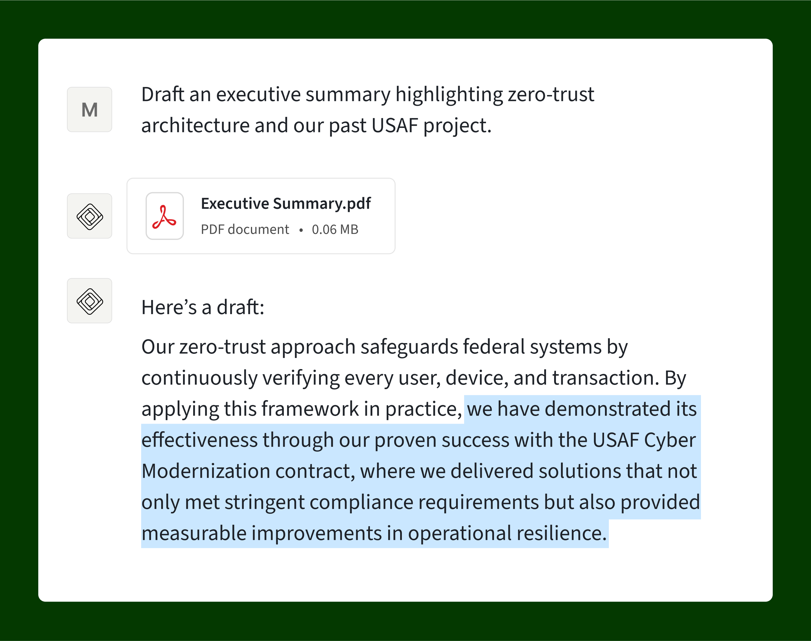 Work with Vultron in natural language, asking questions and refining drafts through dialogue. Proposal teams can collaborate conversationally with AI just like they would with a colleague.